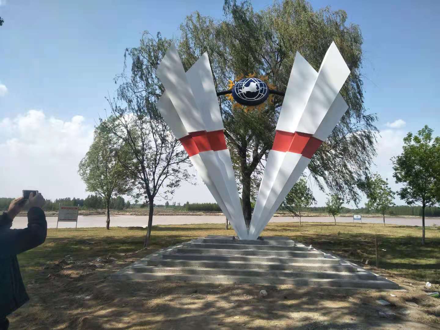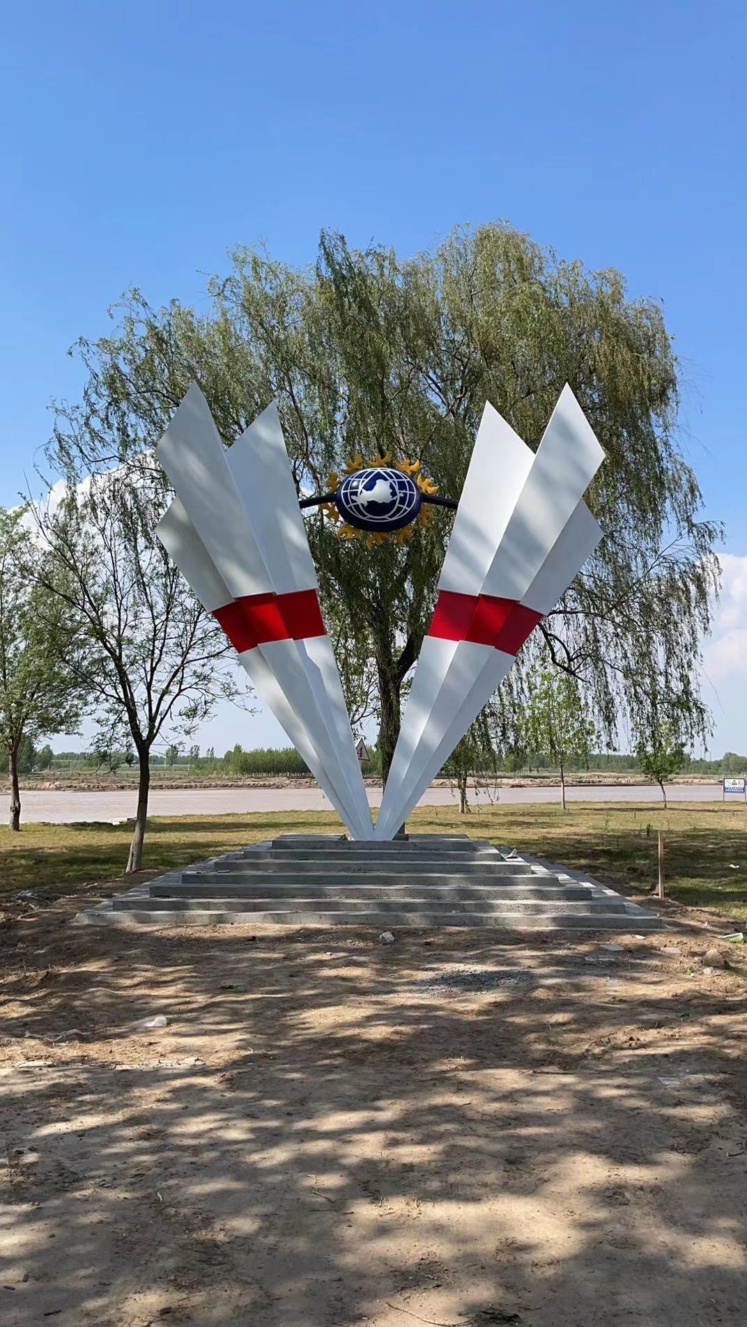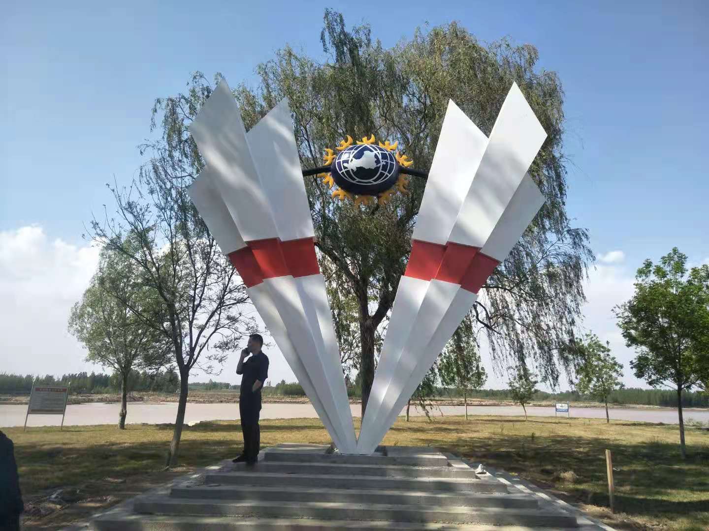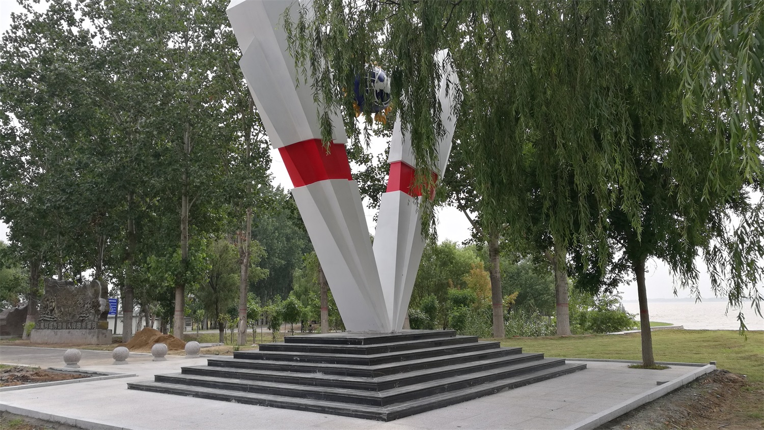 雕塑整體呈扇形構(gòu)造,代表黃河三角洲扇形外貌;兩側(cè)形似利劍,寓意治黃工作者敢于“亮劍”的拼搏精神; 中間球形,寓頂點(diǎn)之意;其上印制有黃河水利委員會標(biāo)志,圍繞十只和平鴿。寓意以治黃事業(yè)為中心、人民幸福、和平安寧、生態(tài)保護(hù)、空間均衡;主體色彩以紅、黃、藍(lán)搭配。紅色代表黨建引領(lǐng),黃、藍(lán)象征海河交匯。寓意治黃事業(yè)在中國共產(chǎn)領(lǐng)導(dǎo)下開創(chuàng)新篇章。