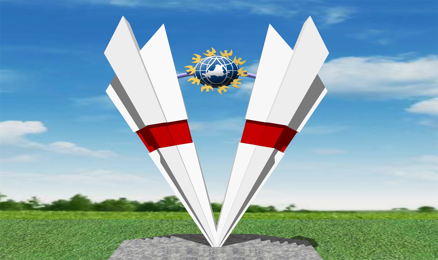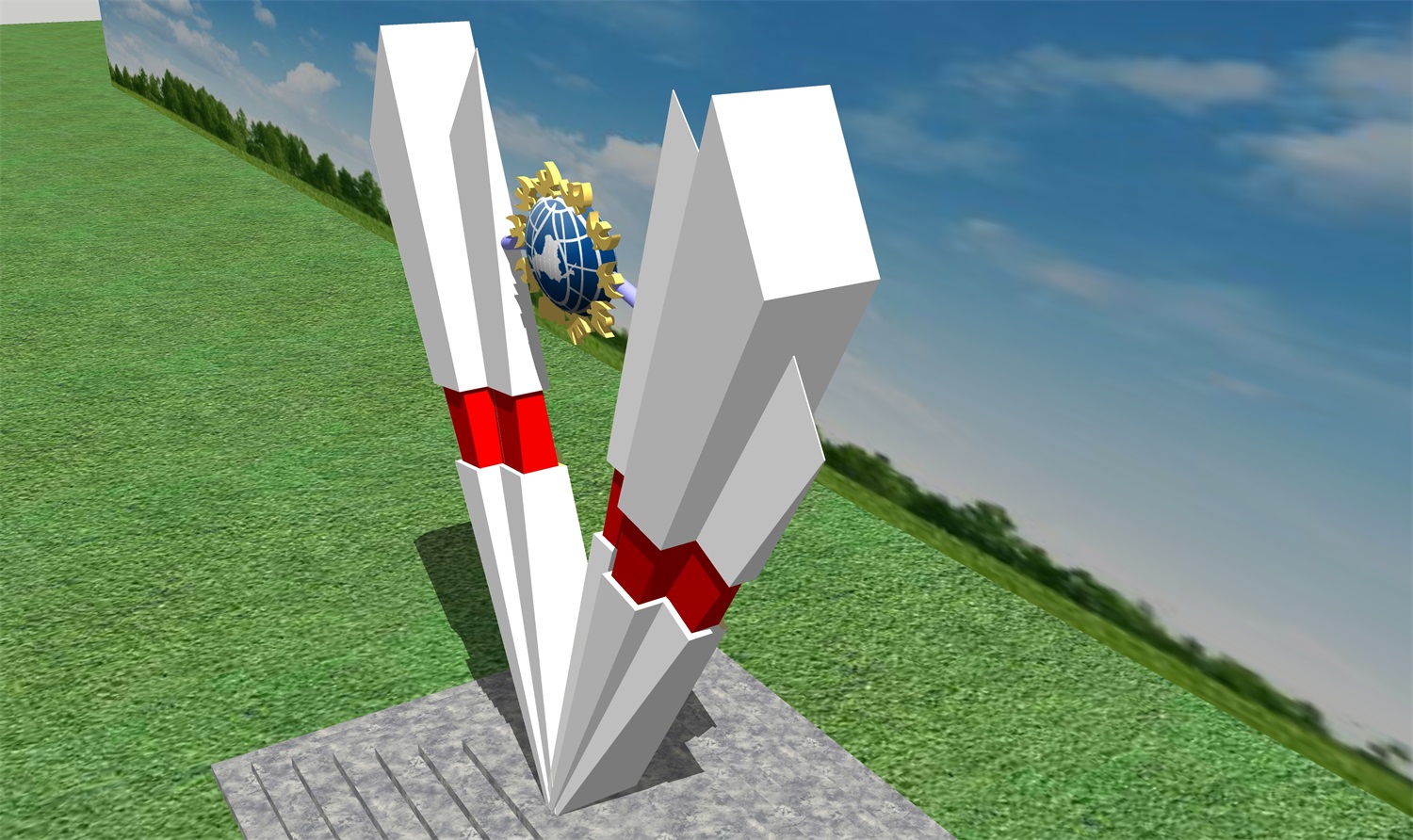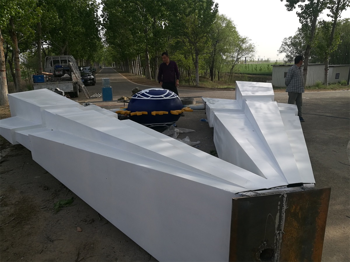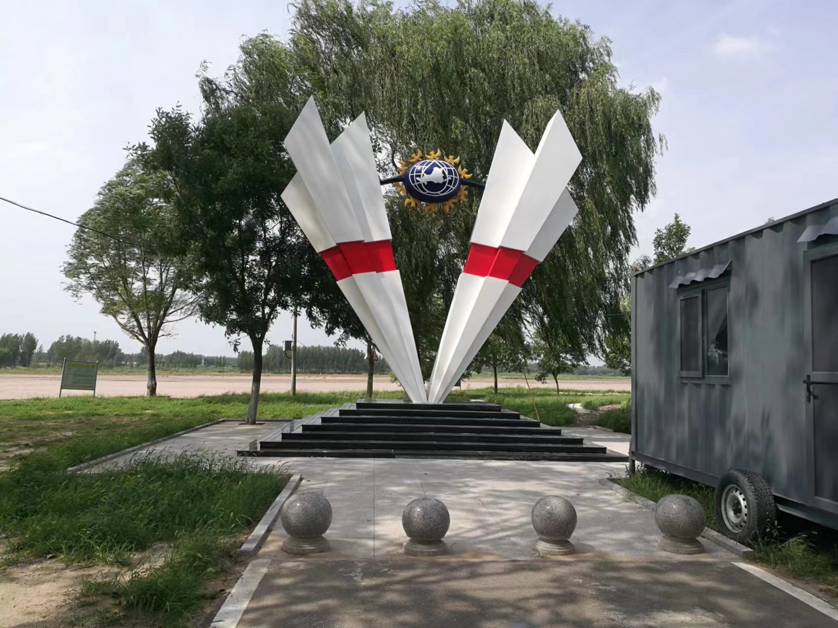 雕塑整體呈扇形構(gòu)造,代表黃河三角洲扇形外貌;兩側(cè)形似利劍,寓意治黃工作者敢于“亮劍”的拼搏精神; 中間球形,寓頂點(diǎn)之意;其上印制有黃河水利委員會標(biāo)志,圍繞十只和平鴿。寓意以治黃事業(yè)為中心、人民幸福、和平安寧、生態(tài)保護(hù)、空間均衡;主體色彩以紅、黃、藍(lán)搭配。紅色代表黨建引領(lǐng),黃、藍(lán)象征海河交匯。寓意治黃事業(yè)在中國共產(chǎn)領(lǐng)導(dǎo)下開創(chuàng)新篇章。