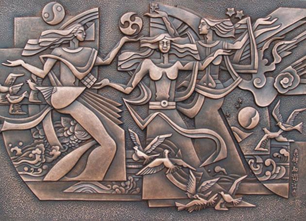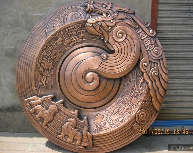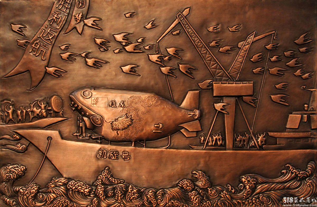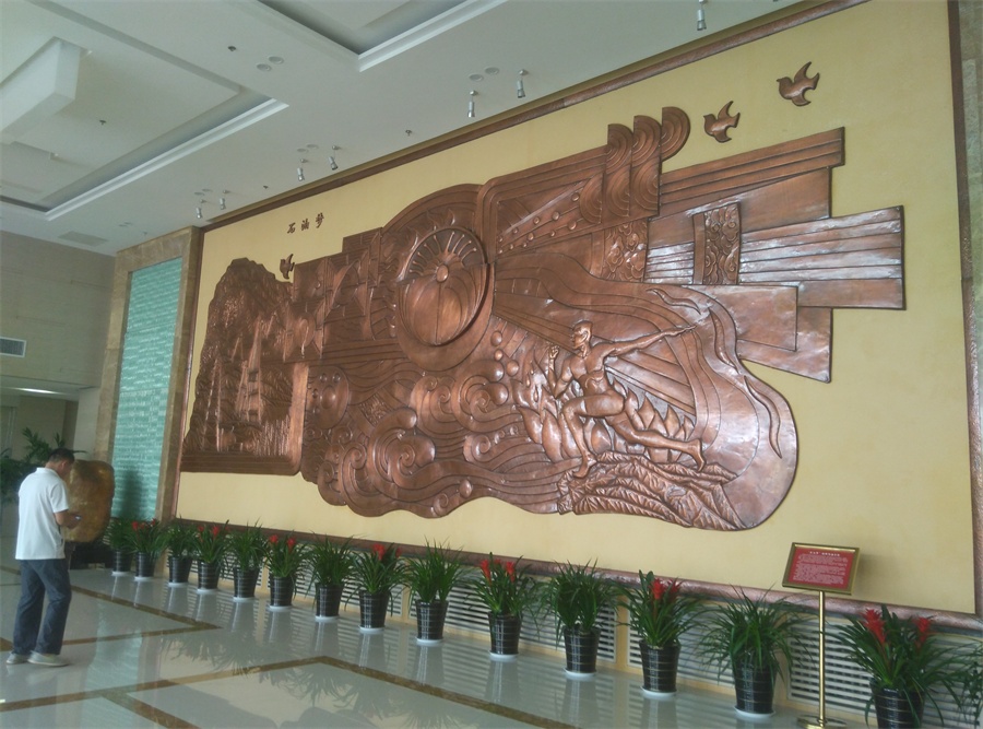 鍛銅雕塑,鍛銅浮雕展示。鍛銅浮雕(又叫鏨銅或敲銅),是利用銅材料的延展性興起來得鏨刻工藝,是我國(guó)傳統(tǒng)手工藝百花中的一枝奇葩。鍛銅雕塑的制作過程是先做出一個(gè)模子,然后用特制的膠粘在固定位置上,將銅板加熱后質(zhì)地變軟的銅板放在模子上用錘子進(jìn)行敲打,敲打后又恢復(fù)堅(jiān)硬,這樣便可以成形,然后進(jìn)行著色處理,最終制作出藝術(shù)作品。