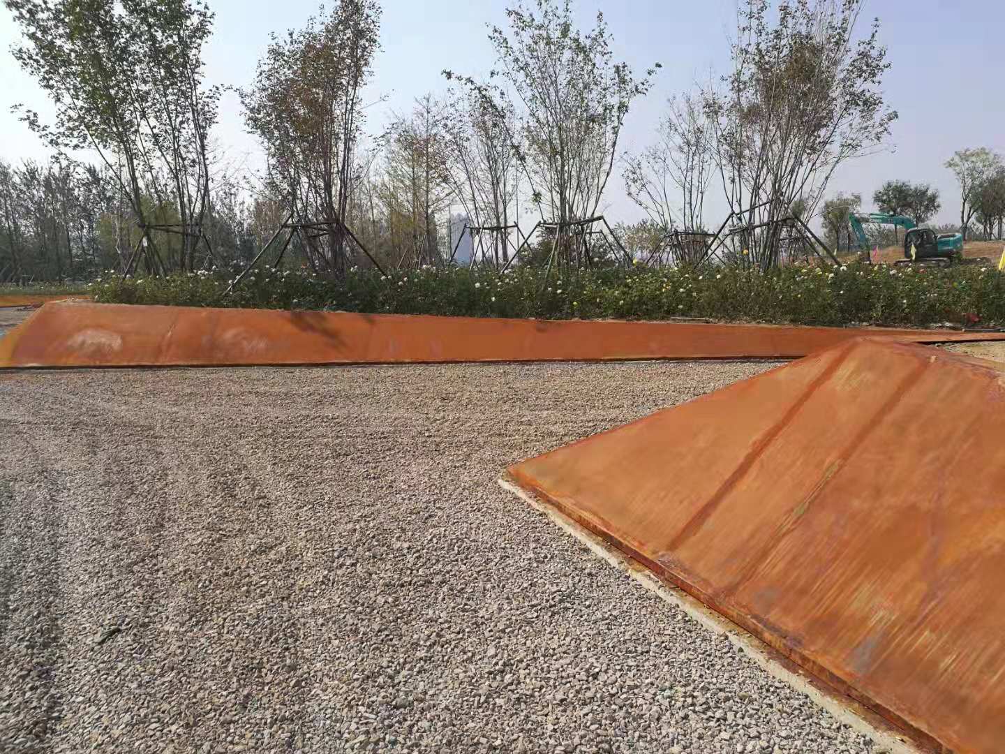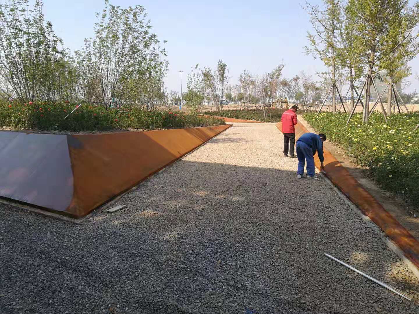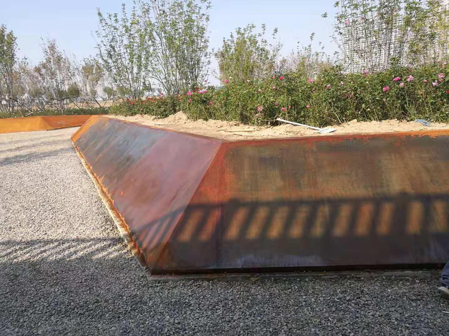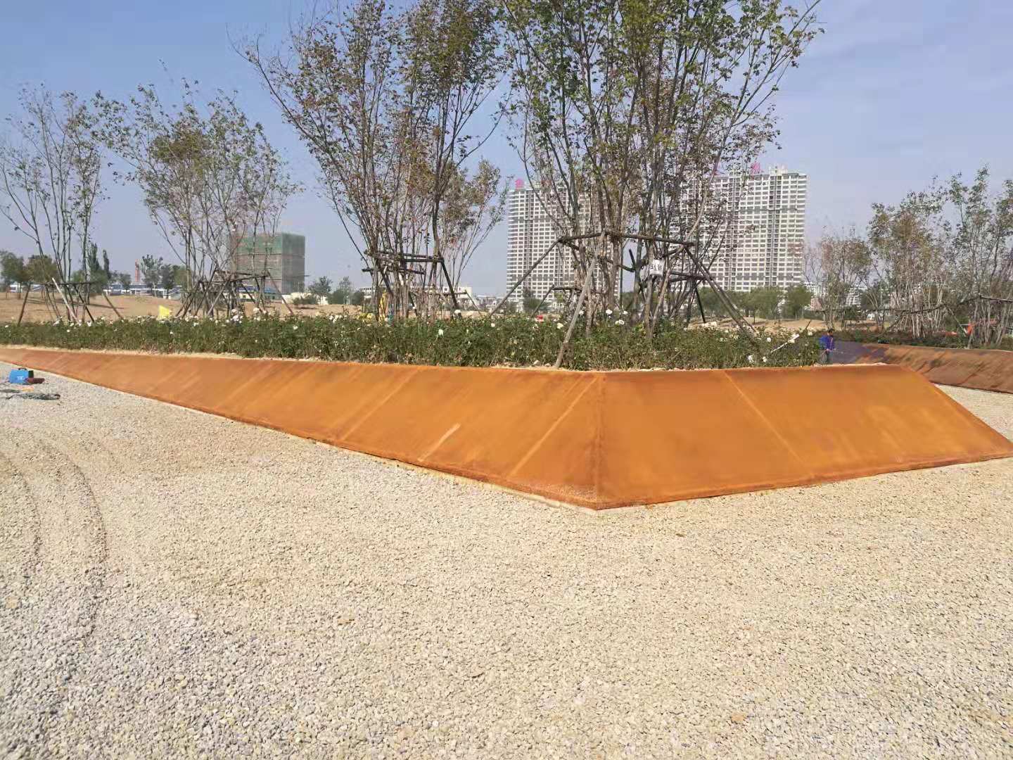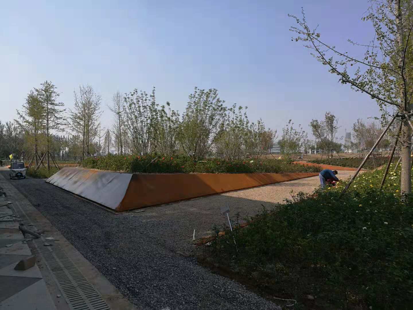 中海植物園即原來的中海景區(qū)東北角的原高爾夫球場區(qū)域,2018年改造升級為濱州中海植物園。所施工的銹板花池共7組,造型表面積共488平方米。造型板采用5mm厚銹板,支撐采用80mm*50mm*2.5mm的U形鋼。采用專業(yè)的耐候鋼生銹劑及固銹劑做表面處理。生銹的初期會呈黃色,然后隨著生銹進程的推移,逐漸顯現(xiàn)金黃色,橙黃色,橙色,橙紅,紅褐色最后在紅褐,或者褐色穩(wěn)定下來。